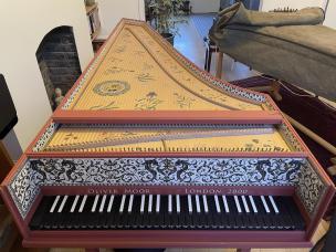 This beautiful instrument is by my favourite modern maker and good friend, Derek Adlam. Based on the single-manual instruments of the Ruckers dynasty, it was made during the early years of the Finchcocks workshops. The original instruments had a compass of just four octaves C/E - c3 short octave, with one 8' and one 4' stop. Much respected for their fine tone, in the eighteenth century nearly all were extended by a process of 'ravalement' in either France or England. The Derek Adlam scheme is unusual in having a broken octave keyboard using the apparent BB key to play GG, and retaining the low sharps with the divided C# playing AA on the front portion and C# at the back. D# plays BB and D#. The top note is d3. Thus the keyboard layout is that used by Stephen Keene and others for English spinets c. 1690 - 1710. It also has an additional set of 8' strings. It has bone keys, and the original plastic jacks were replaced with wooden sets in new registers in 2023, with goose-quill plectra. It has recently been re-strung with Burkett historic brass and P-iron. It was built for A 44o and is non-transposable due to the broken octave, but it would surely be happy at A415. Please see the Sale Page for pictures and details.
