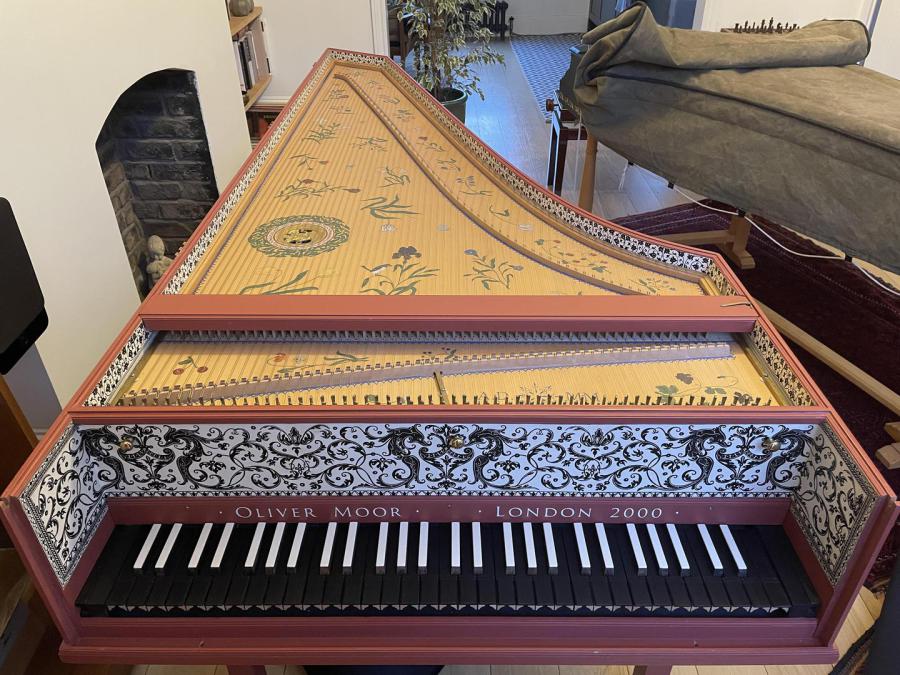 This harpsichord was carefully built in 2000 from the Early Music Shop kit by Oliver Moor. It was designed by John Barnes after the instruments of the Ruckers dynasty, incorporating improvements to the interior bracing introduced by Albert Delin. This single-manual example offers the options of transposing either up or down from the current pitch of A415. Please see the Sale Page for pictures and details.