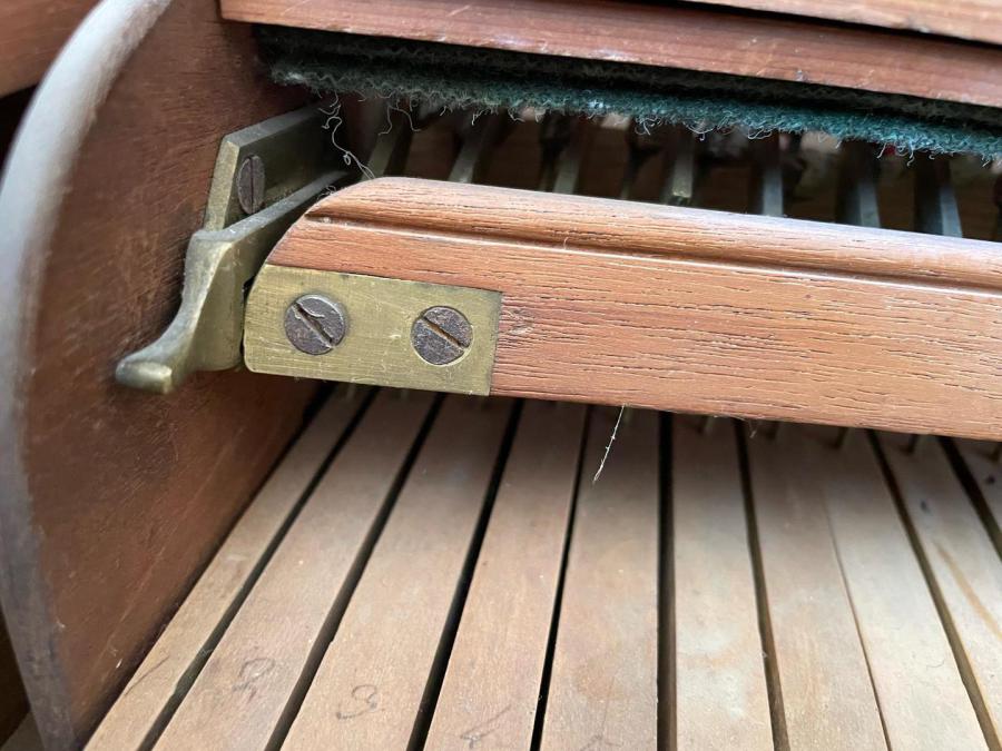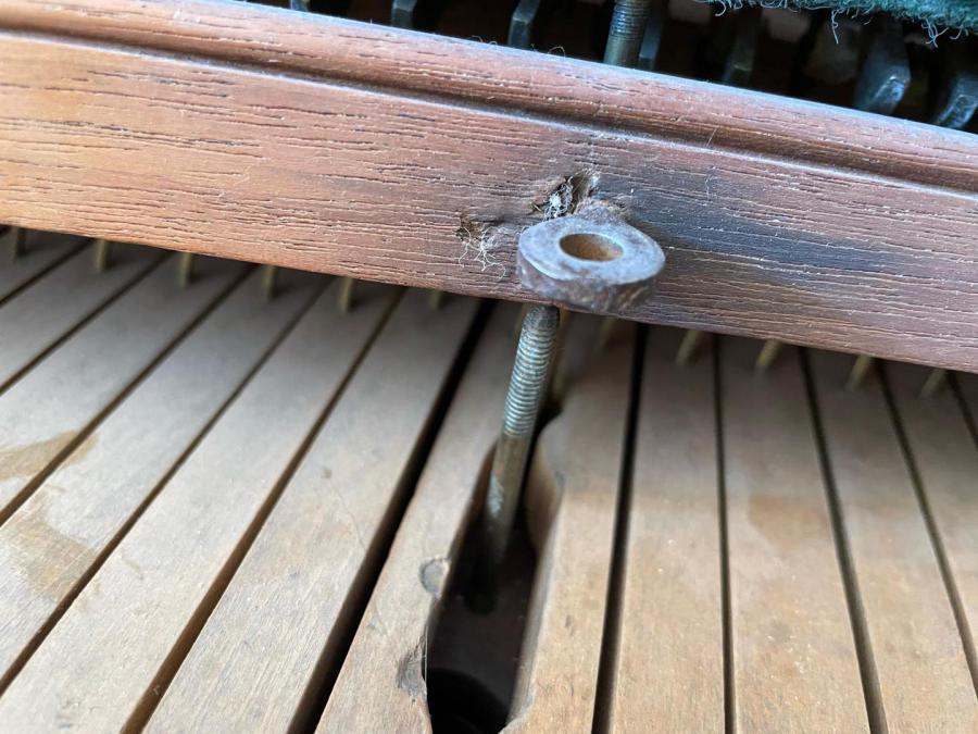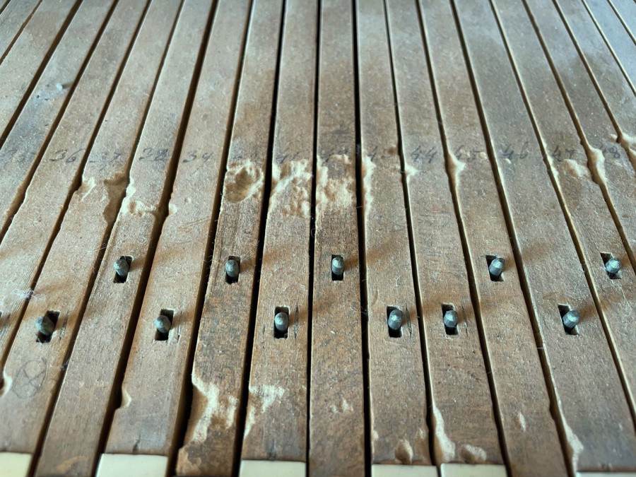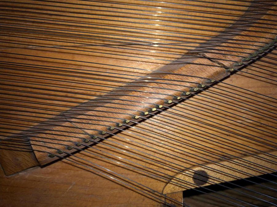 The grain in the bridge is 'short' in these early pianos, and shrinkage cracks are quite common - there are two on this one, and the strings have been de-tensioned as a precaution. As long as he bridge is still secure, these can be repaired from above.