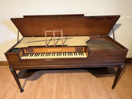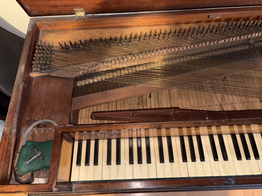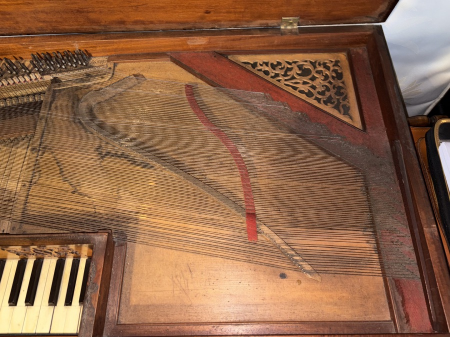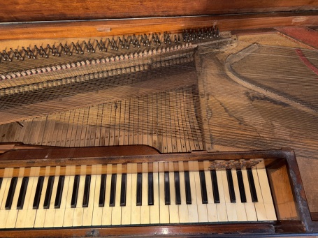 No structural problems or issues with the soundbpoard and bridge are immediately apparent, and the owner assures us that all the notes work. As well as thorough cleaning, it does deserve a new set of strings, followed by the usual adjustments and of course tuning. It did originally have a pedal; this is now missing, but was a simple fabrication from flat pieces of mahogany to match the elegant French stand. Holes in the bottom of the piano and the music shelf are a guide for restoring this.