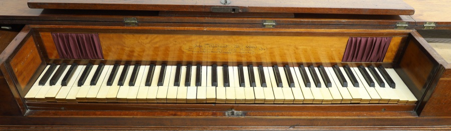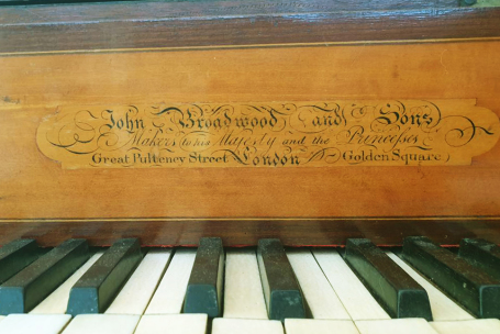 The satinwood nameboard adds to the puzzle: the inscription is for John Broadwood and Sons (plural) the style adopted after 1809 when Thomas Broadwood, John's son by his second wife, came of age and was made partner. We may deduce from this that the piano was returned to the workshops for refurbishment, possibly after a period as a hire instrument, and the calligraphy updated. The change to the undercarriage could have been made at this time, although the style with four legs (rather than six) was not introduced until about 1830. It may be possible to confirm this from the original records which are held in the Surrey History Centre.