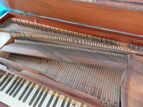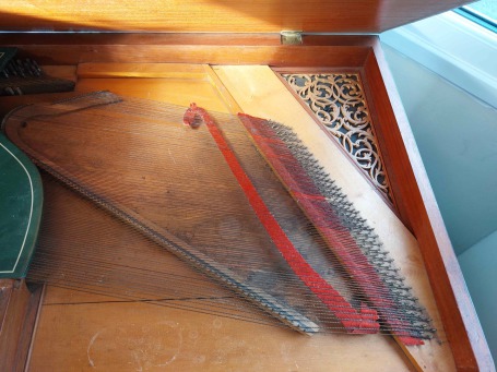 Sondboard, bridge, and hitchpins look good. There is one open joint in the soundboard, but this could almost certainly be shimmed from above, an these open joints seem to have no effect on the sound anyway.