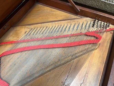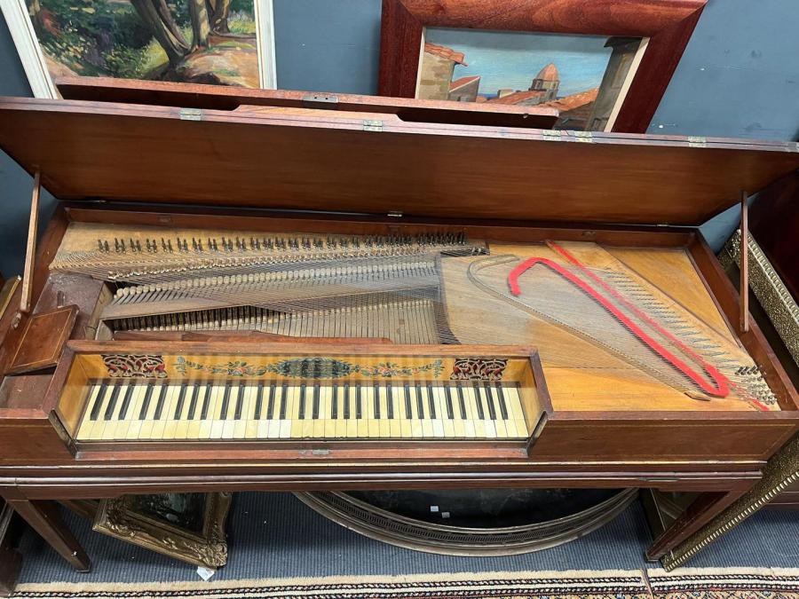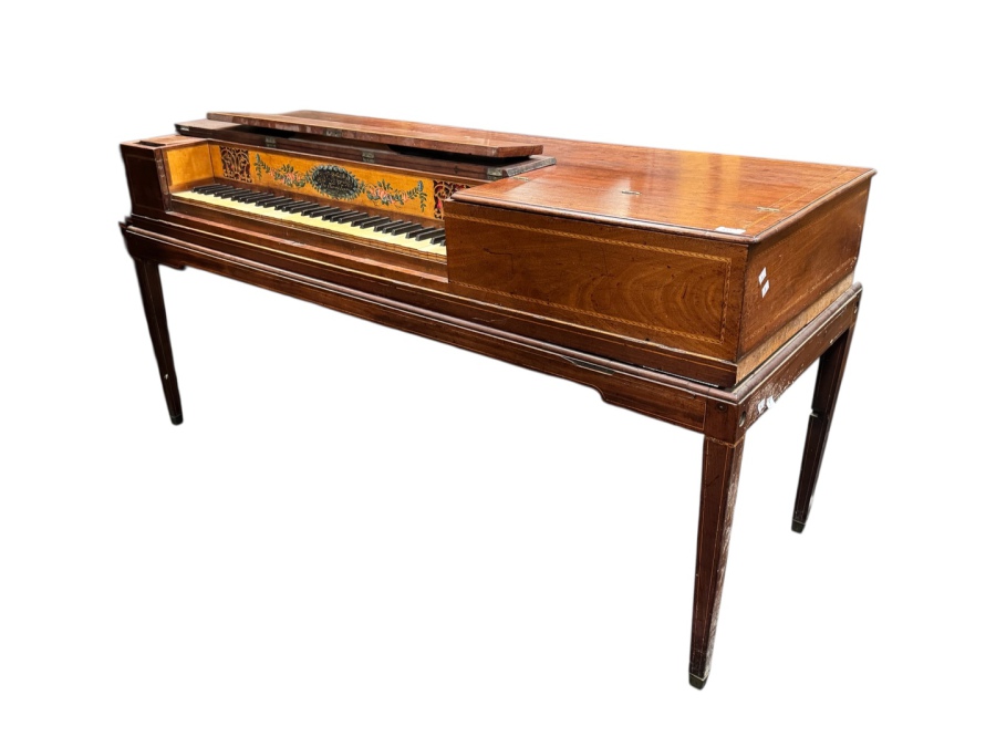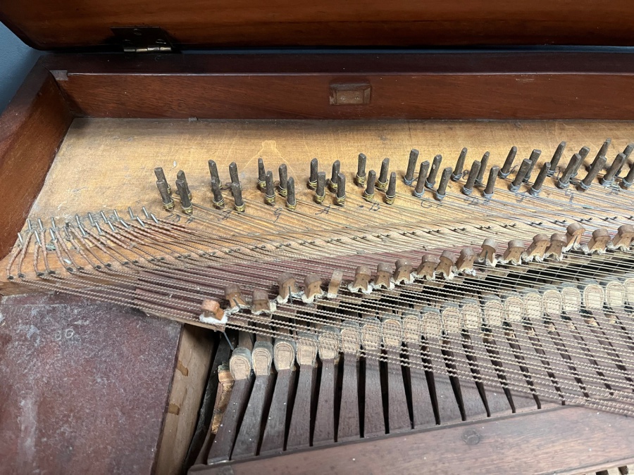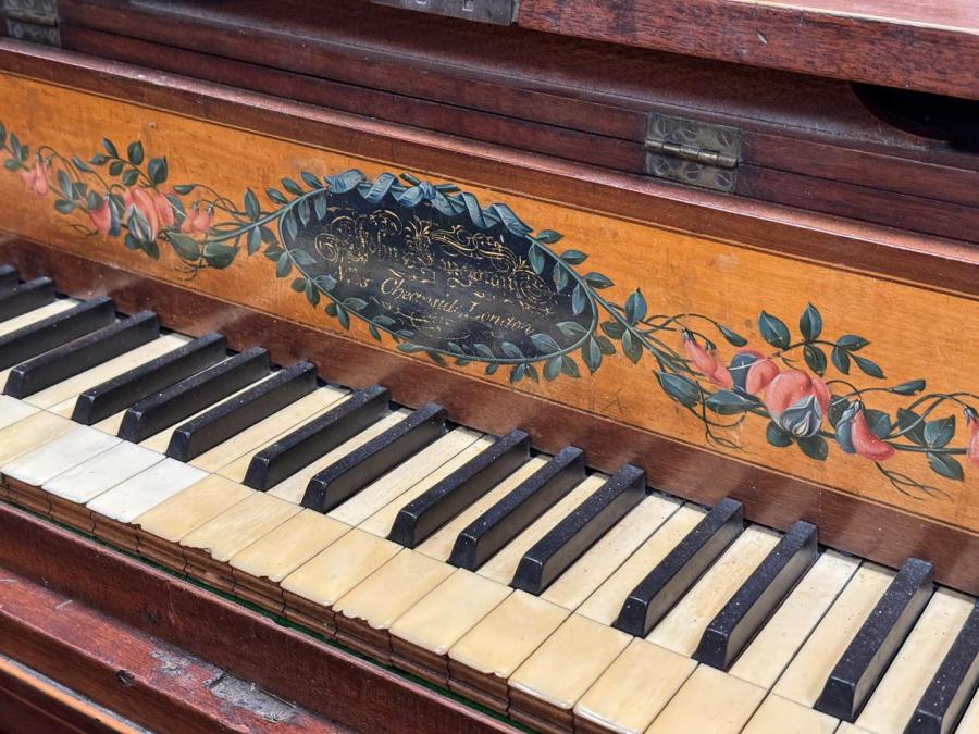 This Clementi- lookalike carries the name 'John Longman' (son of James) on the nameboard, surrounded by the familiar garland of sweet peas. It is technically curious in that most of the wrestpins are at the back of the case Broadwood style, instead of at the right, as was usual until nearer 1820.