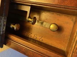 The inlay around the name-cartouche is typical of L&B, but the name itself is missing. We would expect to see an enamel plate, but it appears that this has been removed, possibly due to chipping damage, and replaced by a plain wooden oval.