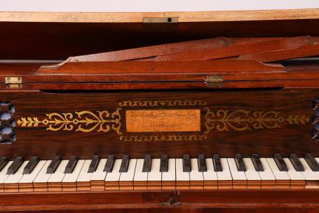 Handsome brass inlay on the rosewood nameboard - 'Maker to His Majesty' (George IV). Thomas Tomkison had made pianos specially for him, notably for the Brighton Pavilion when he was Prince of Wales.