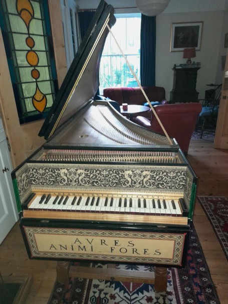 The original plastic jacks were replaced with wooden sets in new registers in 2023, with goose-quill plectra. It has recently been re-strung with Burkett historic brass and P-iron. It was built for A 44o and is non-transposable due to the broken octave, but it would surely be happy at A415.