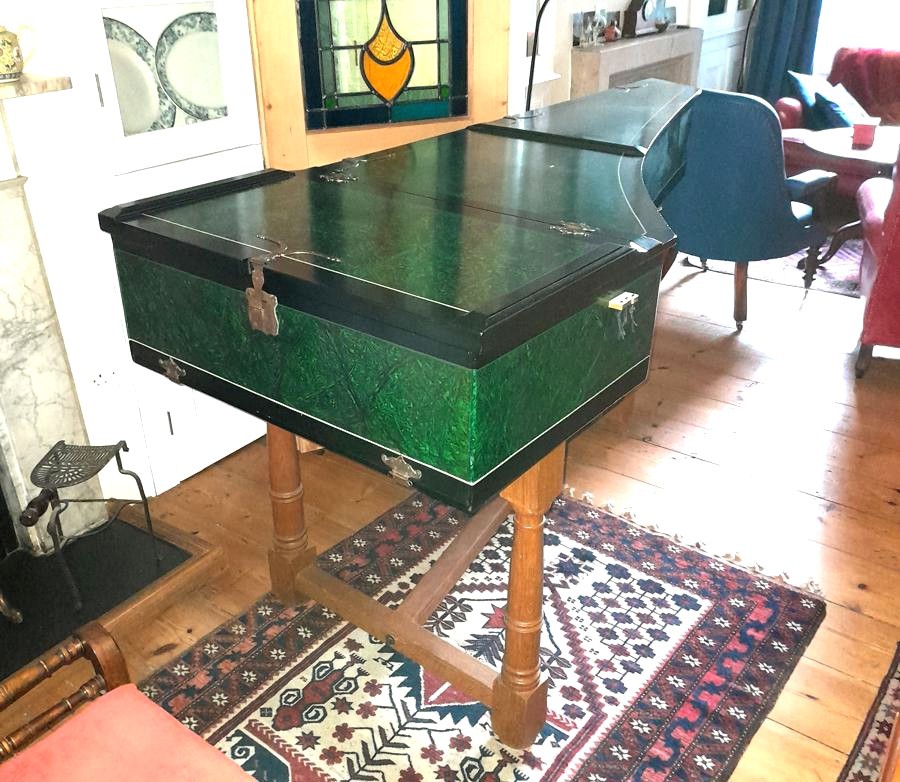It is in a beautiful malachite green case with authentic brassware. There is an oak stand. There is a new oak music desk, which fits inside the case. The soundboard is not painted.