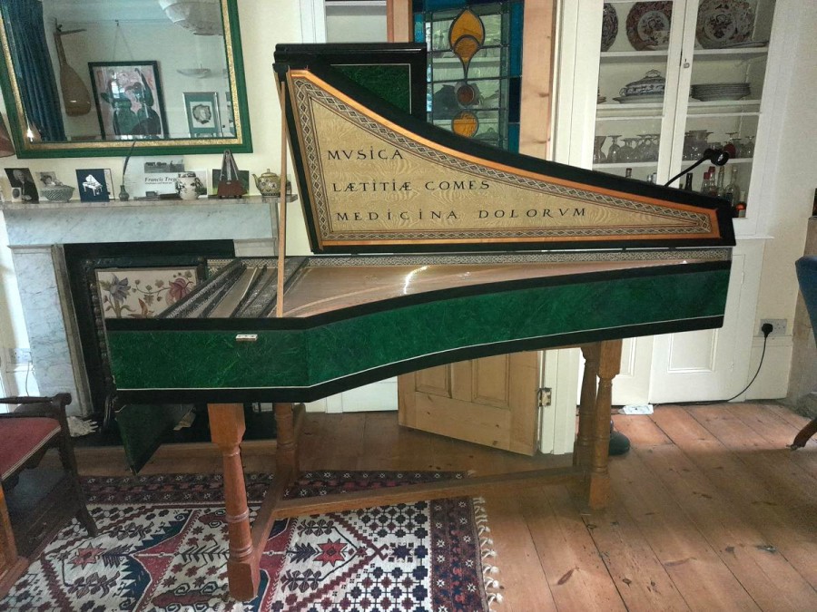 This beautiful instrument is by my favourite modern maker and good friend, Derek Adlam. Based on the single-manual instruments of the Ruckers dynasty, it was made during the early years of the Finchcocks workshops. The original instruments had a compass of just four octaves C/E - c3 short octave, with one 8' and one 4' stop. Much respected for their fine tone, in the eighteenth century nearly all were extended by a process of 'ravalement' in either France or England. The 'Derek Adlam' scheme is unusual in having a 'broken octave' keyboard using the apparent BB key to play GG, and retaining the low sharps with the divided C# playing AA on the front portion and C# at the back. D# plays BB and D#. The top note is d3. Thus the keyboard layout is that used by Stephen Keene and others for English spinets c. 1690 - 1710. It also has an additional set of 8' strings. It has bone keys.