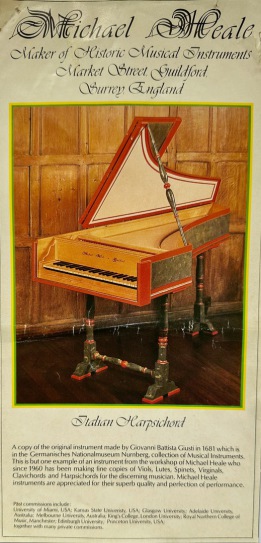This small instrument was made in 1983 by the late Michael Heale of Guildford, renowned musical instrument maker. It is a copy of a 1681 original by Giovanni Battista Giusti in the Germanische National Museum Nürnberg collection of musical instruments.