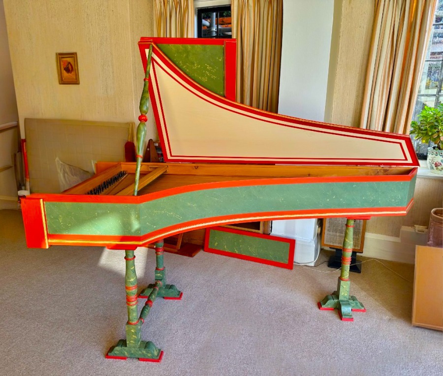 It was completely overhauled by Andy Durand in 2023, when new turkey quills and dampers were installed, and it was re-strung with Malcolm Rose brass.