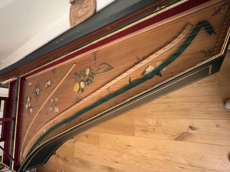 The natural keys are bone (no ivory problems!) and the sharps are solid ebony. The soundboard is beautifully decorated with no visible cracks or splits.