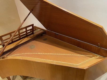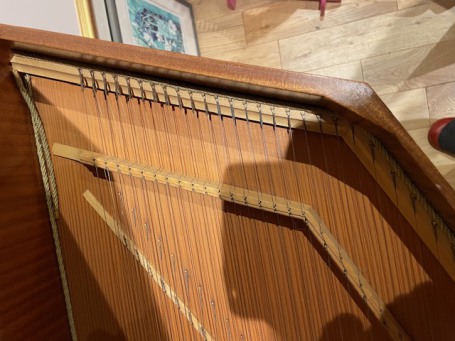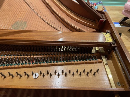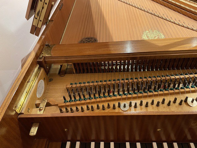 There are two 8' registers plus 4'. The arrangement of the strings and tuning pins is unusual, with pins for the second 8' register on the far side of the 8' nut, and the strings sharing the 4' nut. The 4' strings pass through this, leading to strings at three levels with all the jacks plucking to the right, rather than the 8' jacks plucking alternately.