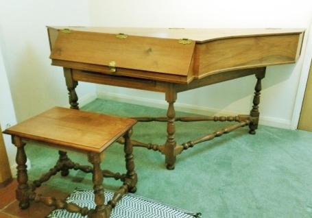 The sharps are of holly, it is in tune at A415. The matching stool in English walnut is included in the sale; the price is £5,600. It is Seaford, East Sussex.