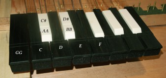 The anonymous 1708 spinet on which this instrument is based has the usual broken octave compass for the time of GG - BB - d3, with AA and BB available on the front part of the divided C# and D# keys, as in the detail below.